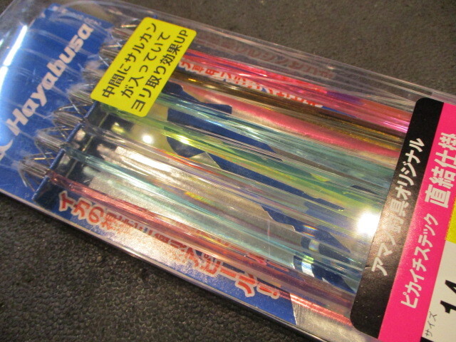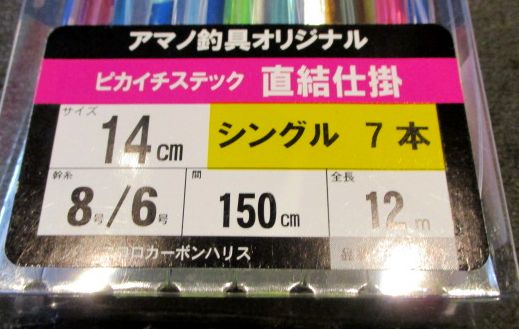 TOP イカ スルメイカ・マイカ仕掛け 直結!ピカイチスティック針 14cm7本針 スルメイカ・マイカ用 直結イカ釣り仕掛け アマノ釣具 価格: ¥2,145 (税抜 ¥1,950、税 ¥195) 販売期間: 数量: 個 在庫 ○ レビューはありません ヤリイカでここ数年はトップ集団に君臨するピカイチスティック。待望の14cmがラインナップされました。 基本、ヤマシタのピッカピカに近いので、スルメイカも乗らないわけがありません。 まるで鏡のようにピッカピカに光る角に、表面がツルっとした形状。スルメイカではピッカピカと1,2を争う鉄板角になると思います。 ピカイチスティック自体はHAYABUSAの製品なのですが、HAYABUSAでは直結仕掛けがありません。アマノ釣具が見事、需要にこたえてくれました。 14cmの7本針です!直結仕掛けはブランコと違って絡みにくいのでご安心ください。 関連商品 イカ袋 Lサイズ 100枚入り イカ釣りであると便利! サンゴ堂特注仕様 ¥1,890(税抜 ¥1,718、税 ¥172) イカには見える!特殊効果!蛍光紫外線コーティング 紫外線本舗 イカプラ角用 たけ店長イチ推し! ¥1,150(税抜 ¥1,045、税 ¥105) イカ活チャ器 (イカ活き絞め) 函館漁師のプロの技 NHKでもとりあげられた!これを使うと甘味が違う!コリコリ感が違う! ¥792(税抜 ¥720、税 ¥72) イカ活チャ器Miniサイズ! (イカ活き絞め) 函館漁師のプロの技 これを使うと甘味が違う!コリコリ感が違う! ¥791(税抜 ¥719、税 ¥72) 楽天、YAHOOでも1000本以上の販売実績!まるでストロボのような圧倒的光量!LSD4灯!超強烈ブルー集魚ライト サンゴ堂オリジナル ¥2,934(税抜 ¥2,667、税 ¥267) イカ角の輝きが新品に蘇る! ジョージイカ角磨き(研磨剤) これで貴方もできる男の仲間入り! ¥871(税抜 ¥792、税 ¥79) イカ角の輝きが新品に蘇る! ジョージイカ角コート(特殊硬質コート) これで貴方もできる男の仲間入り! ¥1,231(税抜 ¥1,119、税 ¥112) イカ角レスキュー 鯖飲み込まれ棒 イカ釣りでもはや必需品ですね!これないと血だらけになってサバを解体する羽目になりますw ¥806(税抜 ¥733、税 ¥73)