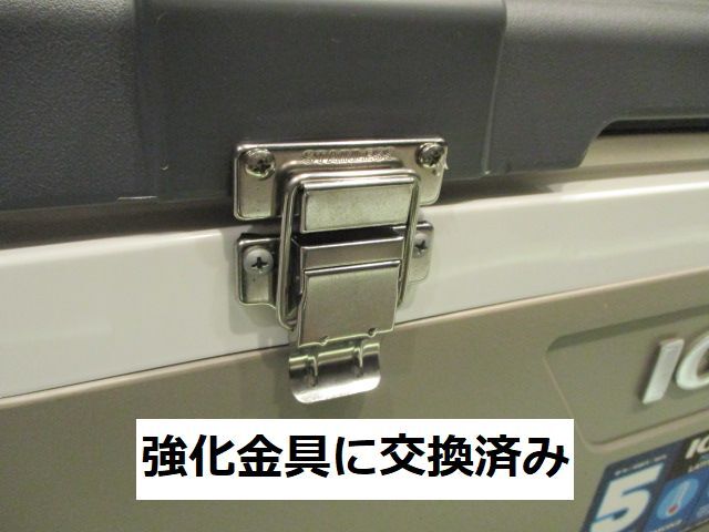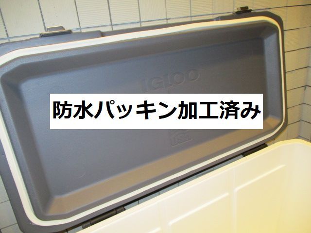 市販のイーグロークーラーはパッキンなどが一切無いために、中の冷気が逃げるどころか、中の海水が確実に漏れてしまい、遠征帰りの車内が大変なことになってしまった経験をお持ちの方も多いと思います。サンゴ堂ではイーグローに、中空特殊防水パッキンを装着し、また錠前も壊れやすいプラスティック製のものから、ステンレス製の金具に変更することで、完全防水と保冷力の向上、そして耐久性の飛躍的なアップを実現しました。既に、遠征船宿や、キンメなどの漁師船など数多くの納入実績を誇り、高い評価を頂いております。