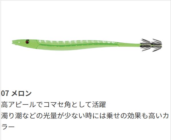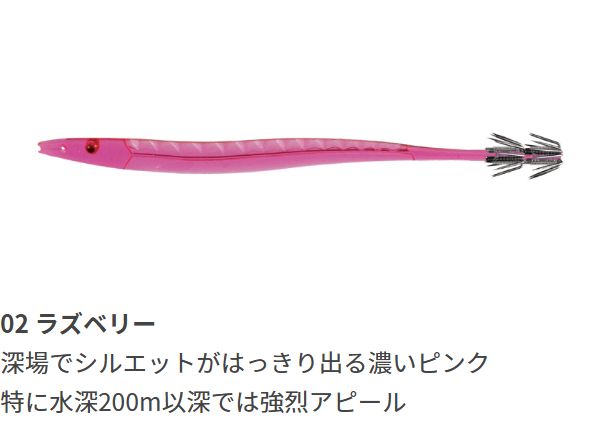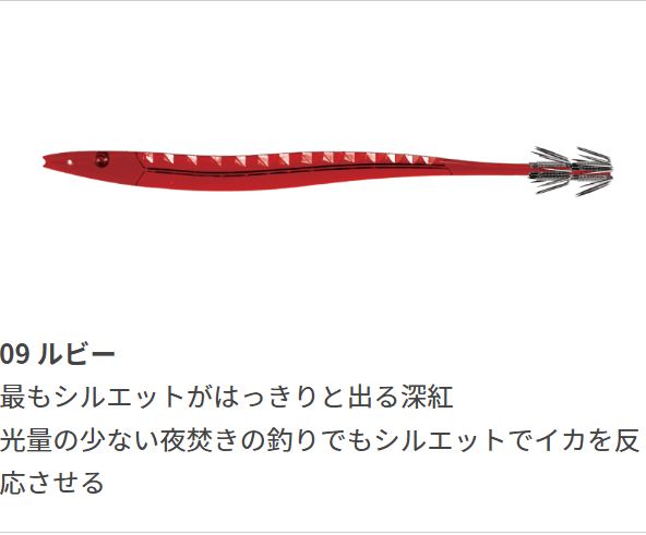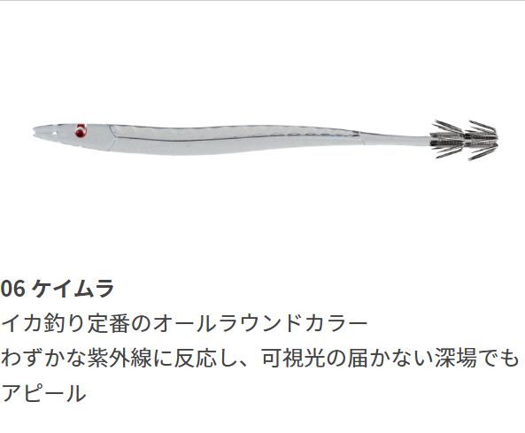 【光効果】 様々に光を反射するウロコ模様でイカに強烈アピール。 【カラー】 全色にラメを搭載&色別の効果を明確にするため単色化。 【ボディ形状】 超薄型カーブボディで海中を舞うように泳ぐ。 【松葉針】 イカ角の大きな動きに対し、フッキングの確実性とバラシ防止のため4本立2段針(16本針)を採用。 【アイ】 集魚効果抜群の赤目付き。