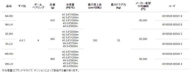 糸巻き量は太目のPEですとN4だと8号300m、12号200M。S5だと8号400m、12号300M。W6だと8号500M、12号400mという感じです。