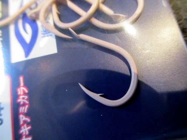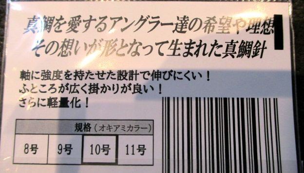 大きさの目安でハリス3号以下で8号(イサキ兼用できます)、ハリス4号で9号、ハリス5号で10号、ワラサも兼ねるハリス6号で11号でいいと思います。12号サイズも追加投入されました。